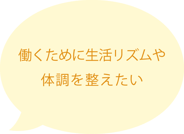 利用開始後は、生活リズムや体調を整えながら、自分のペースで来所していただき、「こんなことやってみたい!」「こんなことが向いてそうだ!」というものを見つけてはたらく力をつけていきましょう。